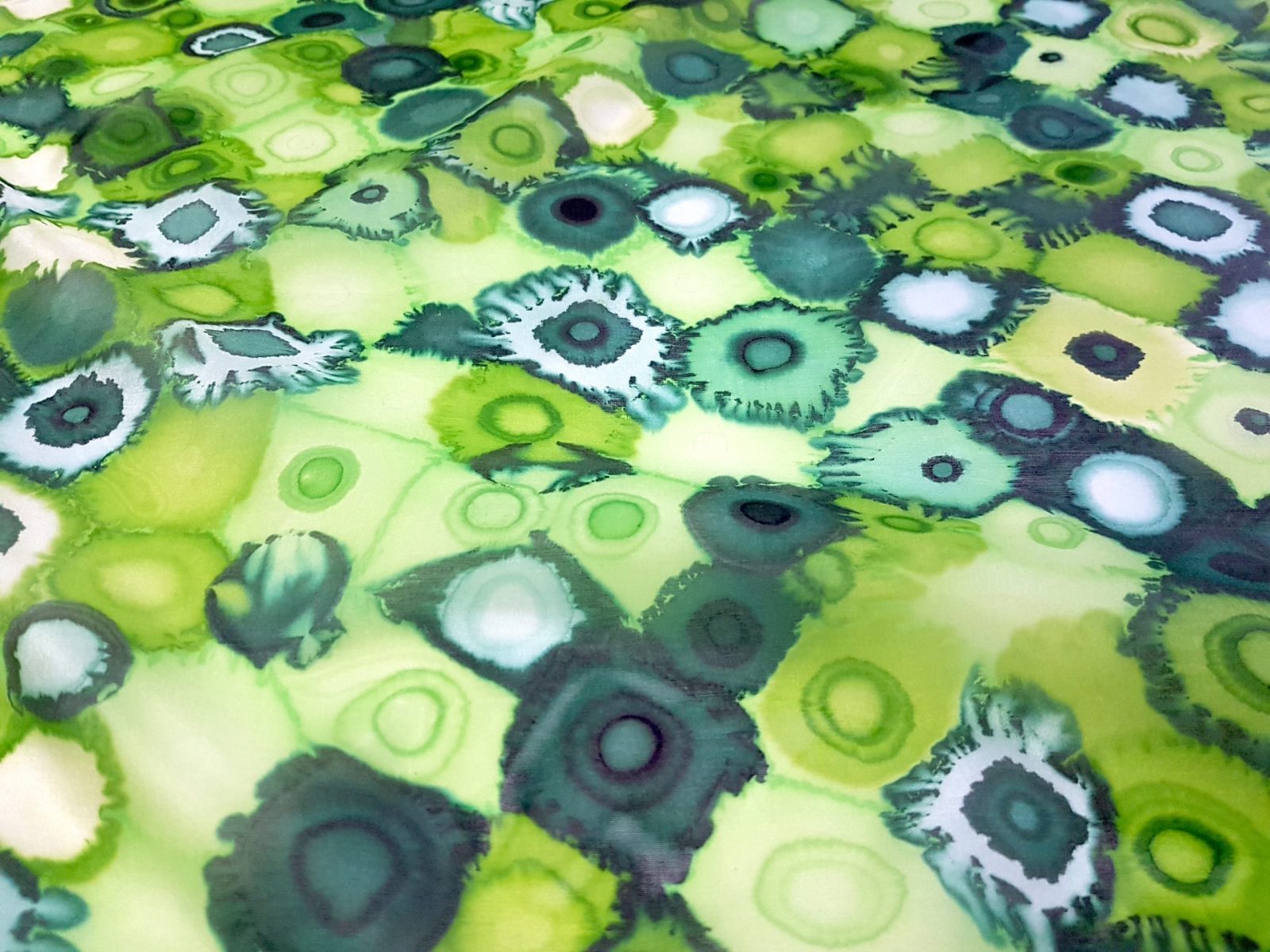 Unikaalsed, kordumatu mustriga, naturaalsele siidile kรคsitsi maalitud rรคtikud suuruses 55 x 55 cm (21.7 x 21.7 in). Ulatub parajalt รผhe korra รผmber kaela.
